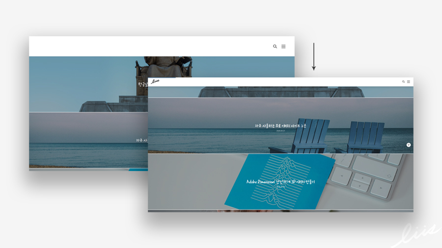 메뉴바에는 검색, 메뉴 아이콘 버튼이 있다. Portfolio 스킨에서는 홈화면과 글화면에서 이 두 버튼들의 컬러가 바뀐다. 스크롤 메뉴바는 배경색이 하얀색이므로 아이콘 버튼들은 검은색 컬러로 고정하기 위해서 이 부분도 수정을 하였다.