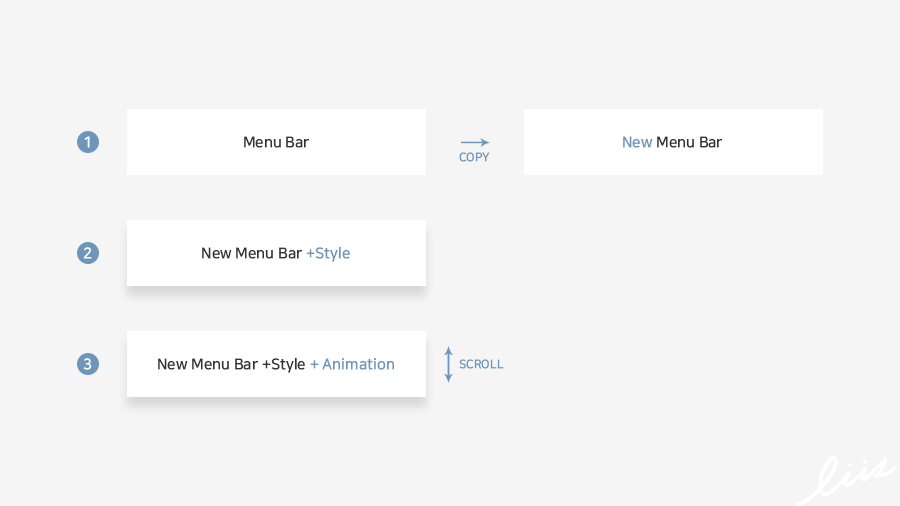- 스타일을 적용한 새로운 메뉴바에 스크롤할 때 상단에 나타나도록 하는 애니메이션을 추가할 것이다.