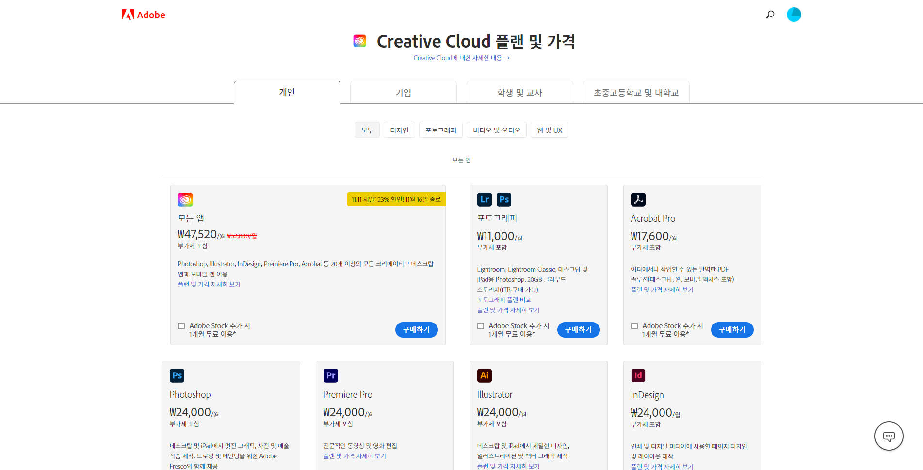 어도비 크리에이티브 클라우드 연간 플랜을 이용하고 있다. 연간 계약하고 달마다 결제를 하고 있는데, 정가 6만원대가 달마다 나가는 것이 사실은 부담스럽기도 하다. 그래서 할인 소식이나 블랙프라이데이 기간을 항상 기다리게 된다. 어도비 홈페이지를 들어가보니 현재 11.11세일을 진행하고 있어서 개인 기준으로 크리에이티브 클라우드 플랜을 23% 할인 하고 있다. 할인 기간에 구매를 하게 되면 달마다 4만원 후반대(월 \62,000 → 월 \47,520)에 결제된다.