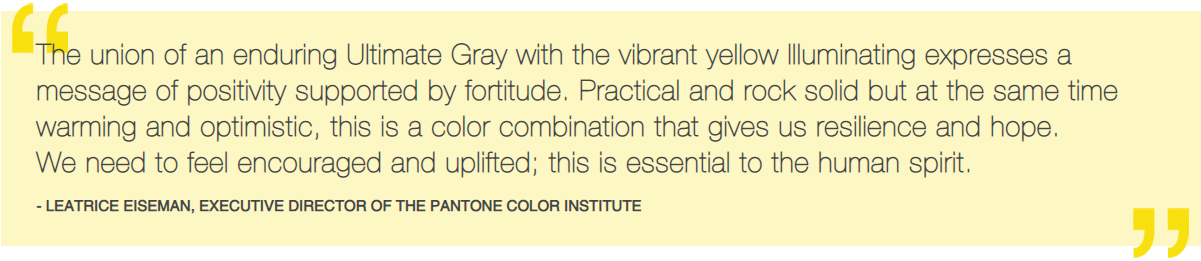 사람들은 계속되는 불확실성을 극복하기 위한 에너지, 명확함과 희망을 가지고 스스로 기운을 낼 수 있는 방법을 찾고 있기 때문에, 활기차고 대담한 색조는 우리가 활력를 얻기 위한 노력을 만족시킨다. 일루미네이팅은 태양에너지로 가득 채운 따뜻한 노란색이면서 밝고 생기를 주는 색이다. 얼티밋 그레이는 변하지 않고 단단한 토대가 되는, 견고하고 신뢰할 수 있는 것들의 상징이다. 해변에 있는 자갈같은 시간의 시험을 견뎌낸 자연물의 컬러인 얼티밋 그레이는 평정심, 안정감과 회복력을 북돋아준다.