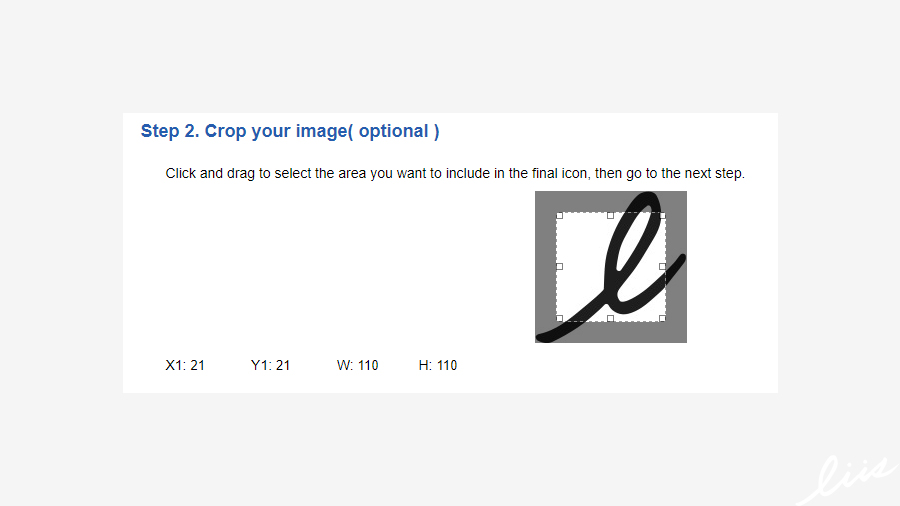 파비콘은 정사각형 모양으로 만들어줘야 하는데, 위 사이트에서 직접 이미지를 정사각형으로 자를 수 있어서 디자인툴이 없는 분들도 쉽게 만들 수 있어서 편하다. 이미지 위에서 직접 마우스로 드래그를 하면 자동으로 정사각형의 모양으로 지정이 된다. (x, y는 위치, w, h는 정사각형 크기를 뜻한다.)