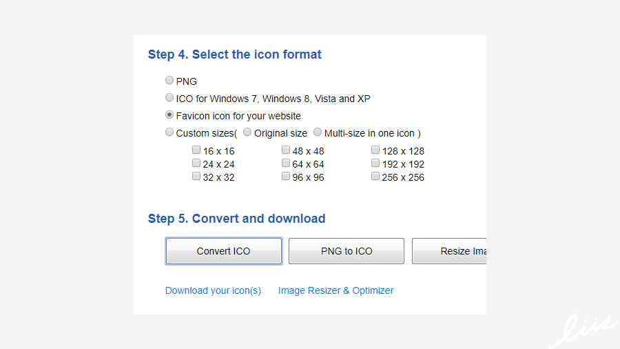 4단계에서 포맷 또는 사이즈를 설정한 후 5단계에서 'Convert ICO' 버튼을 클릭하면 버튼 바로 아래에 'Download your icon(s)' 링크가 생긴다. 다음 링크를 클릭하면 파비콘이 다운로드된다.