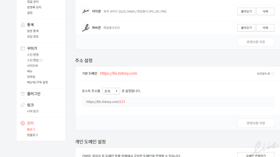 티스토리 블로그에 파비콘을 등록하는 방법은 관리자 페이지에서 '관리>블로그' 메뉴로 들어가면 된다. 파비콘 탭에서 '불러오기' 버튼 클릭 후 다운받은 파비콘을 선택하면 된다.