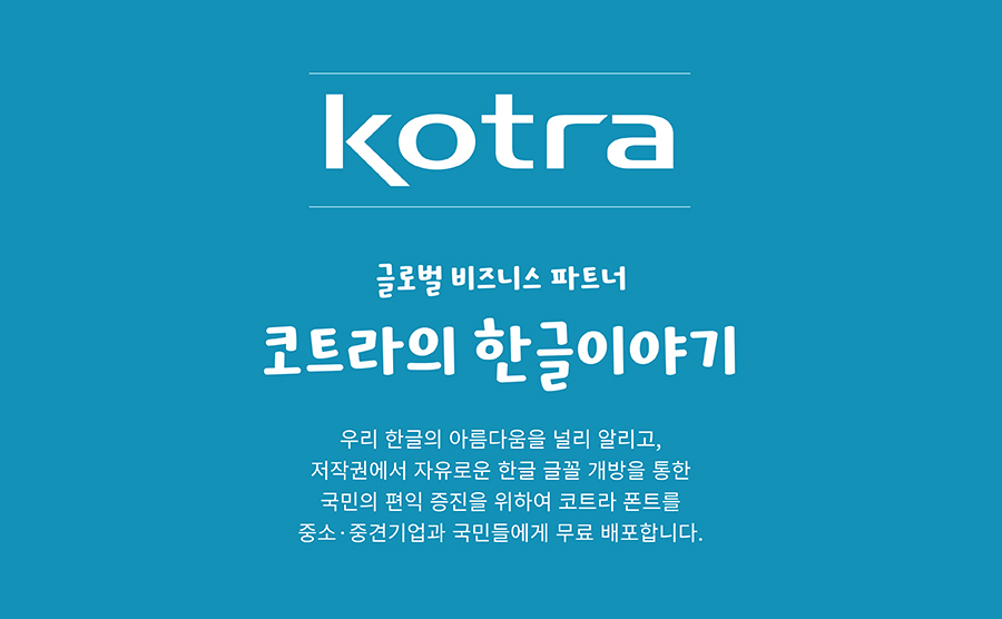 KOTRA(대한무역투자진흥공사)에서는 코트라도약체와 코트라희망체 2가지가 새로 배포되었다. 그외에도 이미 3가지 기본 서체(볼드, 고딕, 손글씨)들이 무료로 배포가 되어있었다. 나는 이번 한글날을 통해서 처음 알게 되었는데 새로 배포된 두 가지 서체 중 손글씨 느낌의 희망체를 소개해본다.
