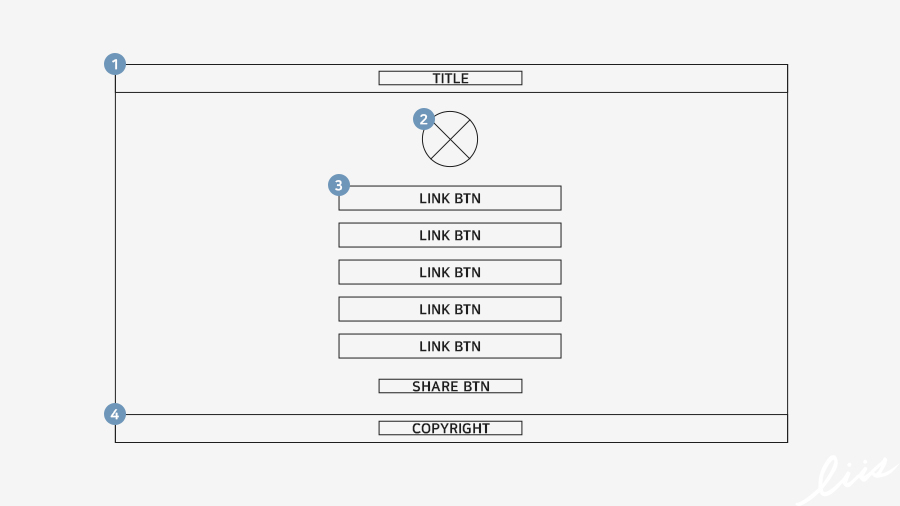 ①<div>: 와이어프레임을 보면 링크 버튼들이 총 5개가 있다. 이렇게 쭉 리스트가 있을 경우 <ul>태그로 전체 리스트 영역을 잡고, <li>라는 리스트 태그를 사용하지만, 나는 이번에 일반 텍스트 태그를 사용했다. 링크 버튼들의 전체 영역은 <div>로 잡는다.