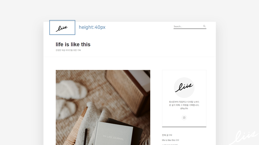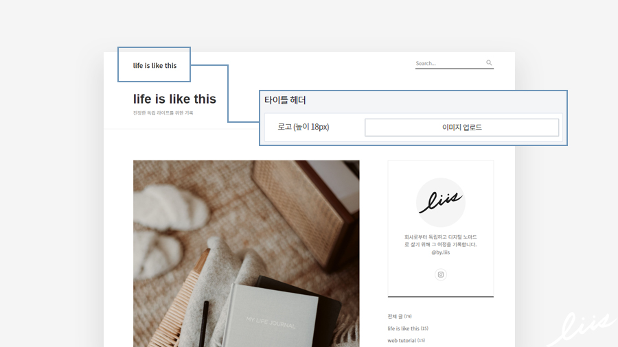 블로그의 타이틀도 이미지로 바로 넣을 수 있게 되어있는데, 텍스트 크기 18px에 맞춰서 고정이 되어있다보니까 로고 이미지의 높이가 '18px'보다 큰 경우 아래처럼 로고가 너무 작게 들어가서 보기가 좋지 않다.