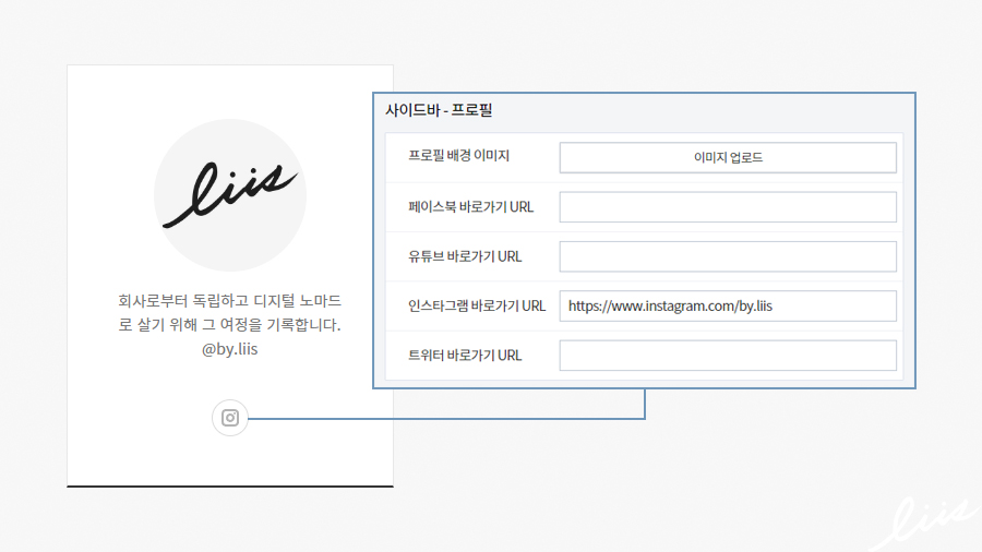 이전 포스팅에 이어서 오디세이 스킨으로 변경하니까 SNS 링크를 입력하면 자동으로 SNS 버튼이 생기는 기능이 있어서, 잘 관리하고 있지는 않지만^^; liis 인스타그램 추가하였다.
