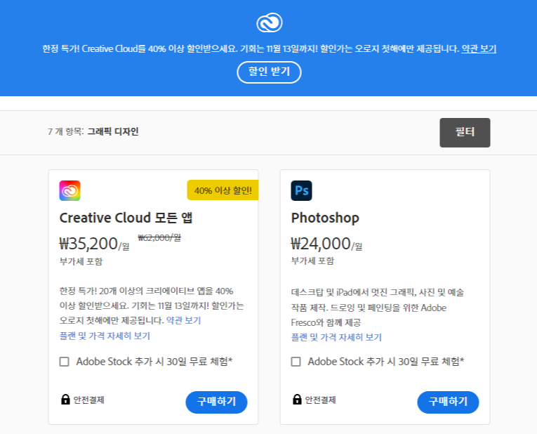 어도비 크리에이티브 클라우드를 매년 구독하는 사람으로서 구독료가 은근히 부담이 된다. 다행히도 어도비에서 매년 블랙프라이데이가 있는 11월에 크리에이티브 클라우드 구독료를 3만원 대로 40% 대폭 할인을 하고 있기 때문에 이 기간을 잘 활용하고 있다. 거의 이 기간이 아니라면 학생이 아닌 일반 유저들은 할인 받을 수 없기 때문에 올해 11월 13일까지 있는 40% 할인 행사를 놓치지 마시길^^! 나도 이번달 10일에 1년 구독 기간이 만료되기 때문에 그날 맞춰서 갱신을 할 예정이다.